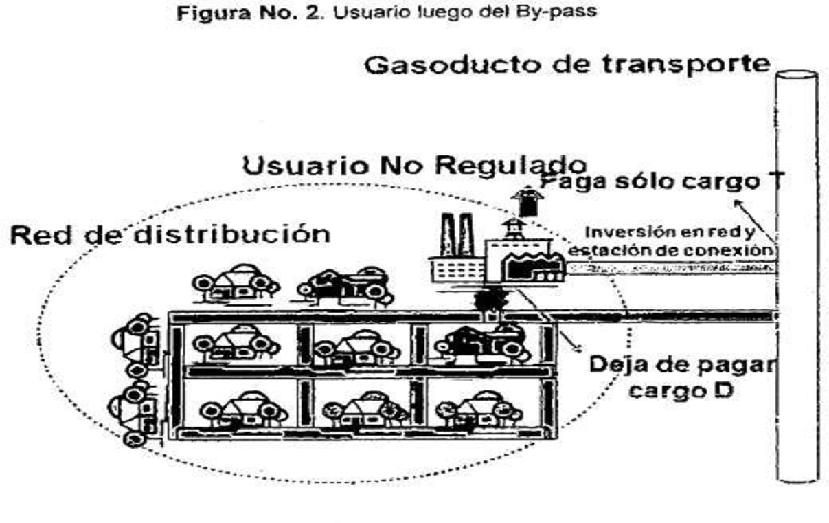 Cuando un usuario con demanda considerable migra del sistema de distribución al sistema de transporte, los usuarios regulados que continúan conectados a la red de distribución no perciben las alteraciones en sus cargos inmediatamente, ya que estos son determinados para un periodo tarifario. Sin embargo, en la revisión tarifaria correspondiente al nuevo periodo tarifario, el cargo para remunerar las inversiones debe contemplar una demanda que ha sido reducida en la cantidad correspondiente como consecuencia del 'bypass', la cual puede provocar un incremento en el cargo y crear nuevos incentivos para que otros usuarios opten nuevamente por el “bypass”, creándose un ciclo de aumentos de cargo y usuarios realizando la migración hacia la red de transporte.