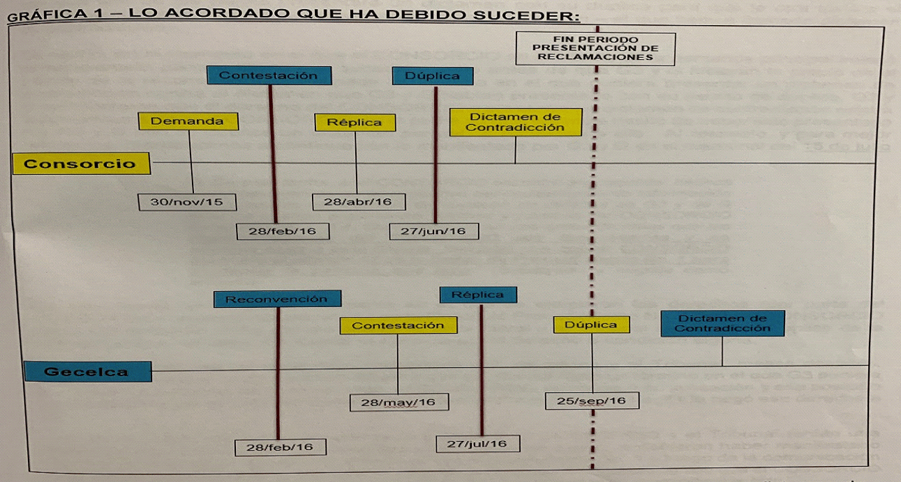 (i) De manera preferente se aplicarían al procedimiento, las normas acordadas por las partes, antes que el Reglamento de Arbitraje Internacional de la Cámara de Comercio de Bogotá “RAI”; (ii) la admisión, el decreto, el recaudo, la práctica, la valoración y, en general, cualquier aspecto relacionado con las pruebas se regiría por las reglas IBA (International Bar Association) sobre pruebas en el arbitraje internacional, salvo que las partes acordaran unas reglas diferentes; (iii) en lo no acordado por las partes, en lo no previsto por el RAI, ni en las reglas IBA, el procedimiento se regiría por la Sección Tercera de la Ley 1563 de 2012; (iv) el término para presentar el escrito de demanda vencía el 30 de noviembre de 2015; (v) el plazo para presentar contestación sería de 90 días calendario, contados a partir del día siguiente a la fecha de presentación de la demanda. Dentro de este mismo término, se debería presentar la demanda de reconvención, si fuere el caso; (vii) el plazo para presentar la contestación a la demanda de reconvención sería de 90 días calendario, contados a partir del día siguiente a la fecha de presentación del escrito de reconvención; (viii) el consorcio tendría un término de 60 días calendario para presentar un escrito adicional de réplica contado a partir del día siguiente a la presentación de la contestación de la demanda y las demandadas tendrían también un término de 60 días calendario para una dúplica, contados a partir del día siguiente a la presentación del escrito de réplica. Estos escritos de réplica y dúplica constituían la última oportunidad para que las partes presentaran reclamaciones o pretensiones adicionales en el trámite arbitral. Además, las partes podrían presentar escritos de réplica y dúplica en caso de demanda de reconvención, en los mismos términos establecidos para la demanda inicial; (ix) las partes acordaron las reglas para el decreto y práctica de las pruebas documentales, testimoniales y periciales. Adicionalmente, convinieron en que el período probatorio se llevaría a cabo en su totalidad en audiencia; (x) las partes presentarían sus escritos de alegatos de conclusión dentro de los 90 días calendario siguientes a la fecha de terminación de la audiencia que declarara finalizado el período probatorio; (xi) la sede del trámite arbitral sería Bogotá D.C., (xii) el Tribunal Arbitral dictaría su fallo dentro de los seis meses siguientes, contados a partir del día siguiente a la presentación de los escritos de conclusión, y haría sus mejores esfuerzos para dictar el laudo dentro de los 90 días siguientes a la fecha de presentación de los alegatos –pero no se determinó en este punto si los días eran calendario o hábiles–; (xiii) todo el trámite sería confidencial, salvo las excepciones establecidas en el RAI y (xiv) se estableció que los gastos y costas del arbitraje serían liquidados de conformidad con los artículos 3.36 a 3.40 del RAI y el artículo 8.5 del marco tarifario aplicable al arbitraje comercial internacional (F. 573 a 588 c. 1).