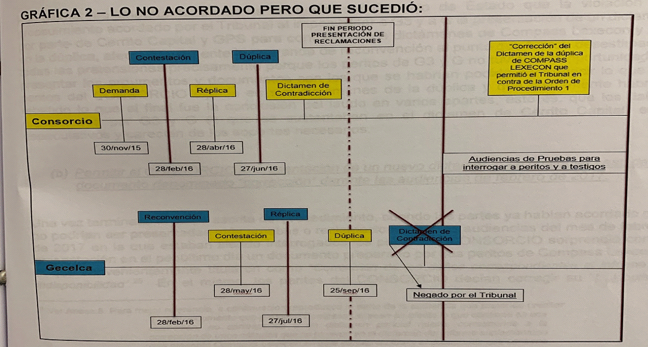 Aunado a lo anterior, el Tribunal desconoció el párrafo 45 de la OP1, al permitir que el consorcio convocante allegara el 14 de febrero de 2017, durante las audiencias de testimonios a los peritos, un documento de “Corrección de los daños correspondientes al informe de indisponibilidad”, elaborado por la firma Compass Lexecon.