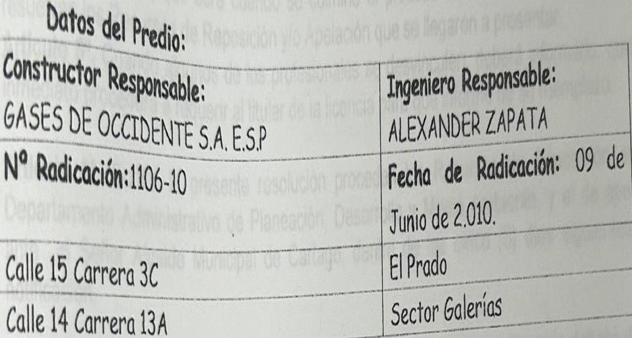 “[…] 1. Que el Señor ENRIQUE ARDILA FRANCO, Abogado adscrito a la Secretaria General de Gases de Occidente S.A. E.S.P. solicitó Licencia de Intervención y Ocupación del Espacio Público, en la modalidad de intervención del Espacio Público para la utilización del subsuelo, consistente en la ampliación de redes de gas en la ciudad de Cartago.