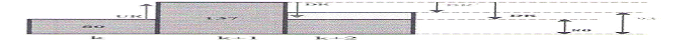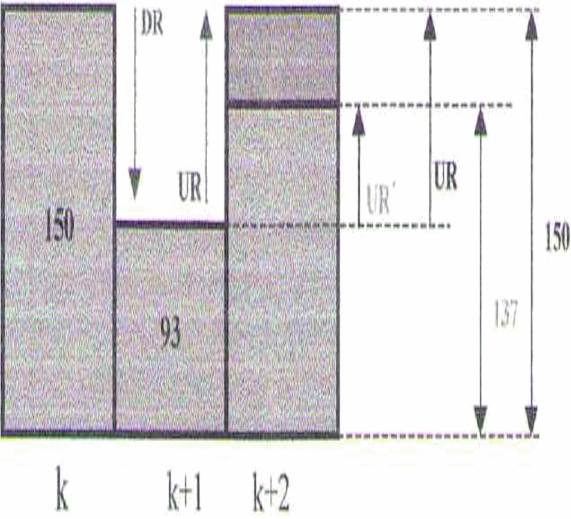 La disminución del despacho programado será limitada por el DR actual en el periodo k+1. El aumento se limitará con el UR' en el periodo k+2, como se muestra en la gráfica siguiente: