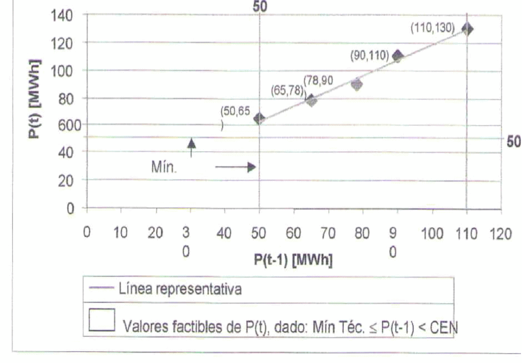 Por tanto, estos valores serían utilizados para modelar la rampa de subida del recurso, desde su mínimo técnico hasta la capacidad efectiva neta, teniendo en cuenta que para un valor dado de P(t-1) mayor al mínimo técnico, el siguiente valor de la rampa P(t) en MWh, debe ser tomado del área sombreada en la gráfica.