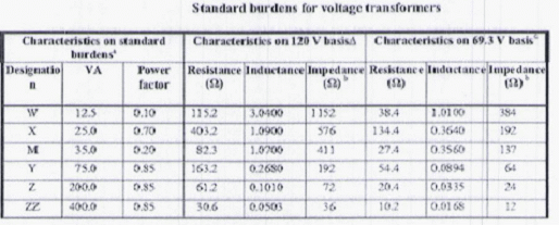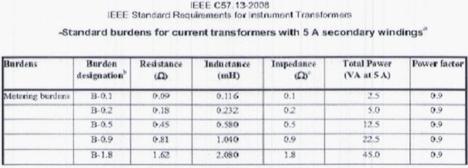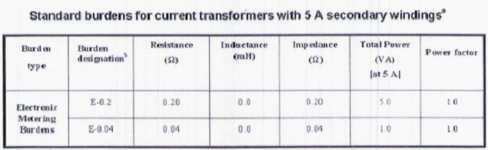 Tabla 8. Burden estándar para transformadores de corriente a 5 A