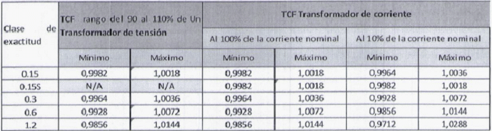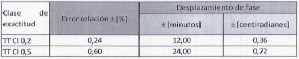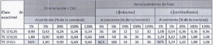 Se indica el error en relación y desplazamiento de fase para los rangos de corriente en TC diferentes a los indicados en el estándar relacionado.