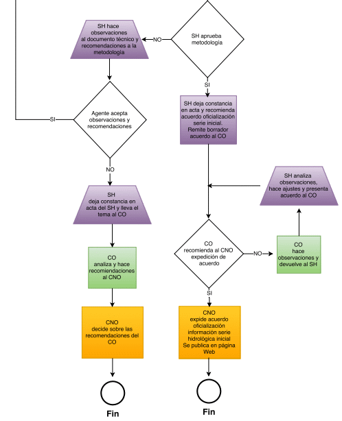 Si al finalizar el proceso de retroalimentación, el SH conceptúa que el documento técnico propuesto por el agente cumple con lo previsto en el numeral 6 y que la metodología de cálculo de la serie hidrológica inicial con lo previsto en los numerales 7.1, 7.2 y 7.3, el SH aprobará la metodología de cálculo y dejará constancia de dicha aprobación en el acta de la reunión y dará su concepto técnico favorable para la expedición de un acuerdo por el cual se oficialice la información de la serie hidrológica inicial y lo remitirá al CO. El CO revisará el acuerdo y dará su recomendación al CNO de expedición del Acuerdo correspondiente. En el evento que el CO tenga observaciones al acuerdo, lo devuelve al SH para que haga los ajustes correspondientes y remita nuevamente el acuerdo al CO. Por último el CNO expedirá el acuerdo y lo publicará en la página WEB del Consejo.