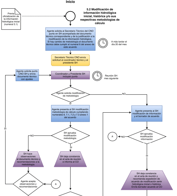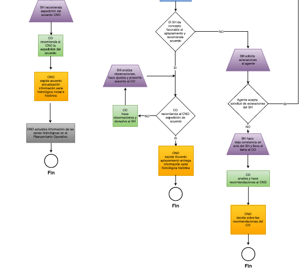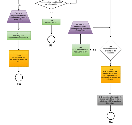 Si el SH está de acuerdo con la justificación de la solicitud de modificación de la información hidrológica inicial o histórica, dejará constancia en el acta de reunión y dará su concepto técnico favorable a la expedición del acuerdo por el cual se aprueba la modificación de la información hidrológica inicial o histórica y lo remitirá al CO. El CO revisará el acuerdo y dará su recomendación al CNO de expedición del acuerdo correspondiente. El CNO expedirá el acuerdo y lo publicará en la página WEB del Consejo. Por último, el Centro Nacional de Despacho, en adelante CND, realizará la modificación de la información de la serie hidrológica inicial o histórica en el Planeamiento Indicativo Energético.
