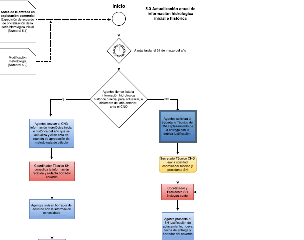 El agente que tenga la información hidrológica inicial e histórica lista para su actualización a diciembre del año anterior, enviará una comunicación escrita al CND con copia al Secretario Técnico del CNO, a más tardar el 31 de marzo de cada año, en la cual se anexe la información correspondiente al año que se actualiza y se cite el acta de la reunión del SH en la cual fue aprobada la metodología de cálculo.