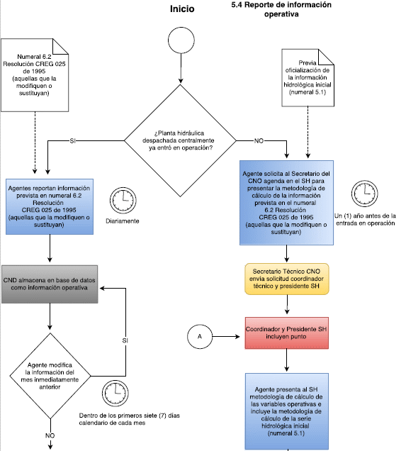 El SH recomendará al CO la expedición del acuerdo por el cual se actualiza de forma anual la información hidrológica inicial e histórica. El CO recomendará al CNO la expedición del acuerdo correspondiente y el CNO lo expedirá y publicará en la página WEB del CNO. Por último, el CND realizará la actualización de la información de las series hidrológicas iniciales e históricas en el Planeamiento Indicativo Energético.