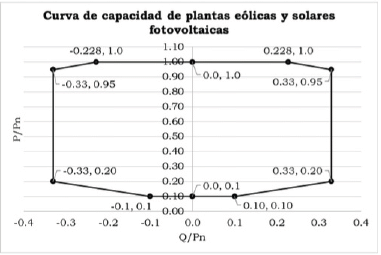 Para tensiones dentro del rango normal de operación en el punto de conexión, deberá operar dentro de los límites establecidos por la curva de capacidad de plantas eólicas y solares fotovoltaicas que se muestra a continuación.