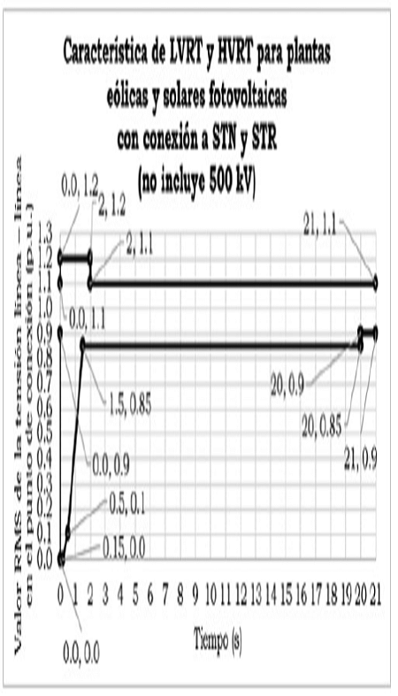 --Para plantas eólicas, si la energía disipada durante las depresiones de tensión es menor a la capacidad nominal del recurso de generación durante 2 segundos, contabilizada en una ventana móvil de 30 minutos. - Para plantas solares fotovoltaicas, deben soportar depresiones sucesivas separadas por 30 segundos entre depresión y depresión.