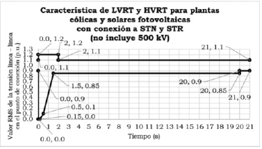 La Característica de depresiones de tensión y sobretensiones para plantas eólicas y solares fotovoltaicas conectadas al STN y STR, que no incluye red de 500 kV, es la que se muestra a continuación: