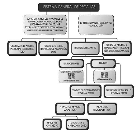 5. Adicionalmente, el artículo 361 de la Constitución Política y artículos 11, 103 y 154 de la Ley 1530 de 2012 establecieron que se deben descontar proporcionalmente del total de los ingresos distribuidos: un 2% para fiscalización de la exploración y explotación de los yacimientos y el conocimiento geológico del subsuelo; un 0,5 % para asignaciones de los municipios ribereños del río grande de la Magdalena y Canal del Dique; un 1% para la administración del Sistema de Monitoreo, Seguimiento, Control y Evaluación y un 2 % para el funcionamiento del SGR.