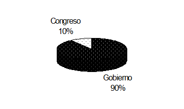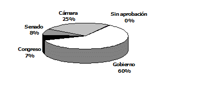 En el gráfico siguiente se observa que los proyectos del gobierno representan el 60% de los programas de inversión aprobados por las dos cámaras, en tanto que los propuestos de origen legislativo, aprobados también por ambas cámaras, ascienden al 7% del total.
