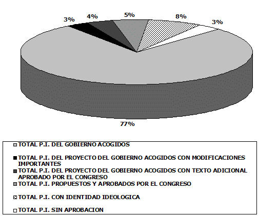 [26] Importa señalar, antes de proseguir en la materia, que se procedió a establecer si el texto del gobierno aparece aprobado plenamente en cada uno de los proyectos de inversión. Cuando las modificaciones fueron sustanciales se clasificó como "total proyectos de inversión (P.I.) del proyecto del gobierno acogidos con modificaciones importantes". Cuando consistió en la inclusión de un inciso o en la eliminación de frases, se clasificó como "total p.i. del proyecto del gobierno acogidos con texto adicional aprobado por el Congreso". Finalmente, aquellos casos en los cuales el texto final recoge ideas del gobierno y de cada una de las cámaras y las refunde en un texto nuevo, se clasificaron como "total p.i. con identidad ideológica entre el texto gubernamental y el legislativo".