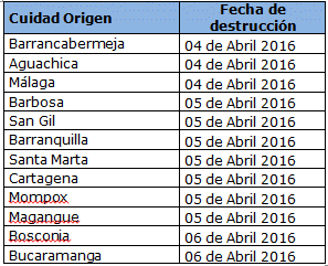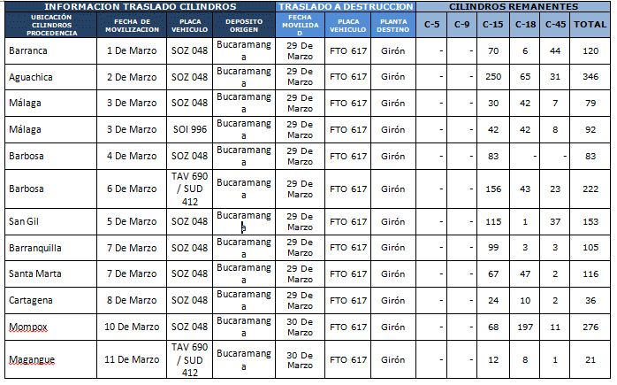 Los cilindros serán traslados al taller de CINSA, ubicado en Km 8, en la cuidad de Girón, Santander; para su destrucción en las siguientes fechas: