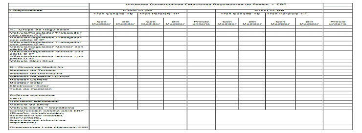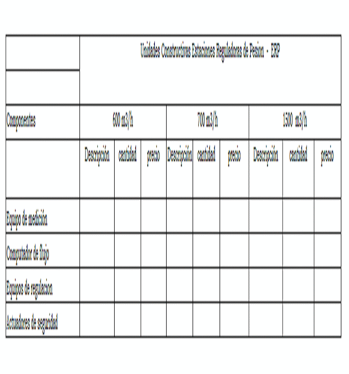 Con el propósito de revisar algunos de los costos de las unidades constructivas de la Resolución en consulta, en relación con las estaciones reguladoras de presión, estaciones reguladoras de puerta de ciudad y las estaciones de gas natural comprimido, se solicita a los agentes enviar la información correspondiente a los precios unitarios y cantidades de obra para la construcción de estaciones de acuerdo con los cuadros anexos. Así mismo, solicitamos enviar los respectivos soportes.