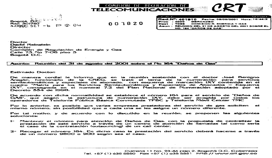 La Comisión de Regulación de Telecomunicaciones - CRT, ha solicitado a la CREG sus comentarios acerca de la utilización de un número único de tres dígitos para el servicio de “Daños de Gas”.