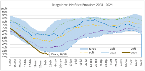 En la Ilustración “Evolución del embalse agregado para la estación seca -Diciembre 2023 a Abril 2024” se mostró la evolución del embalse agregado del Sistema Interconectado Nacional (SIN) en contraste con el rango del historio de los niveles de embalse, para el día 15 de abril, el nivel agregado se encontraba en 29.46%.