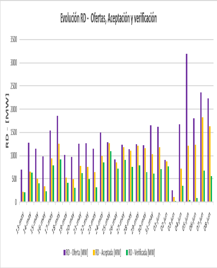 En la siguiente gráfica se muestran las cantidades de energía (en GWh) asociadas a las desconexiones aceptadas para cada día de la semana, desde la entrada en vigencia del programa y hasta el 19 de junio de 2024: