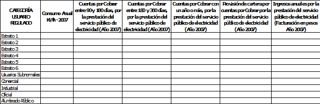 La Dirección Ejecutiva de la Comisión de Regulación de Energía y Gas, con el fin de continuar con los estudios necesarios para establecer la metodología para determinar el cargo de comercialización, se permite solicitar a las empresas que desarrollan la actividad de comercialización de energía eléctrica a usuarios regulados, el diligenciamiento del formulario anexo a esta circular debidamente firmado por el Gerente y el revisor fiscal. La información del anexo corresponde al año 2007 y es complementaria a la entregada en años anteriores.