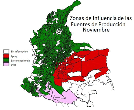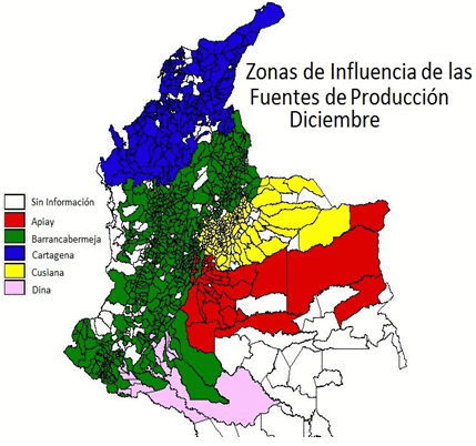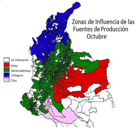 Mapa de Colombia con la identificación de los municipios de cada zona de influencia
