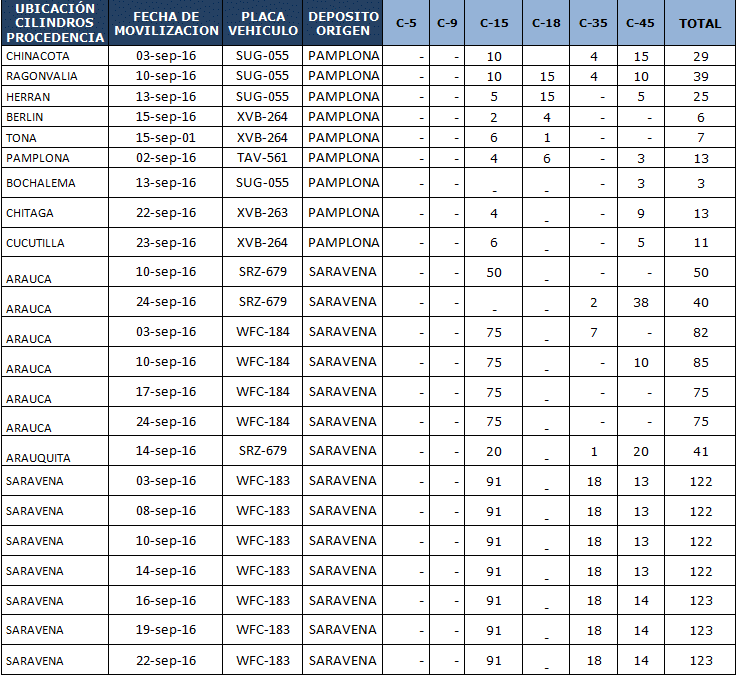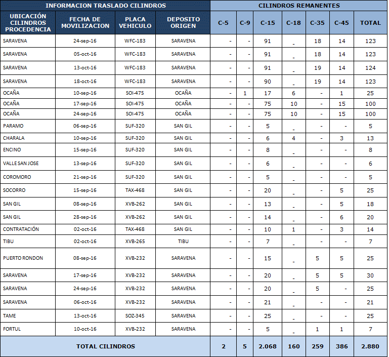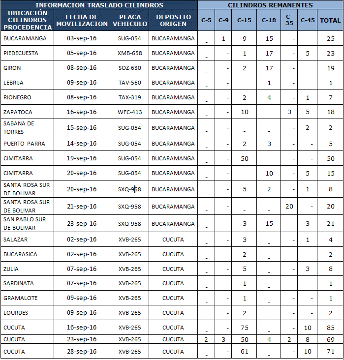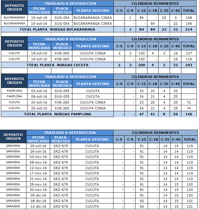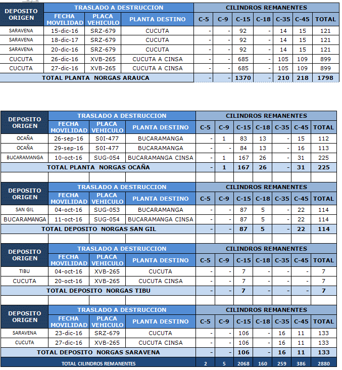 En respuesta a la anterior disposición regulatoria, la empresa Norte Santandereana de Gases E.S.P., que realiza las actividades de distribución y comercialización minorista en el Departamento del Norte de Santander, mediante comunicación con número de radicado E-2016-008874, informó la cantidad de cilindros universales remanentes en su poder y la programación de movilización y destrucción de los mismos.