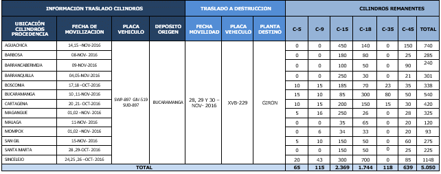 Los cilindros serán traslados al taller de CINSA, ubicado en Kilometro 08 en la cuidad de Girón, Santander; para su destrucción en las siguientes fechas: