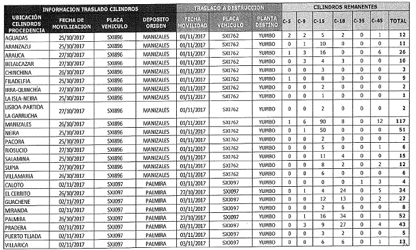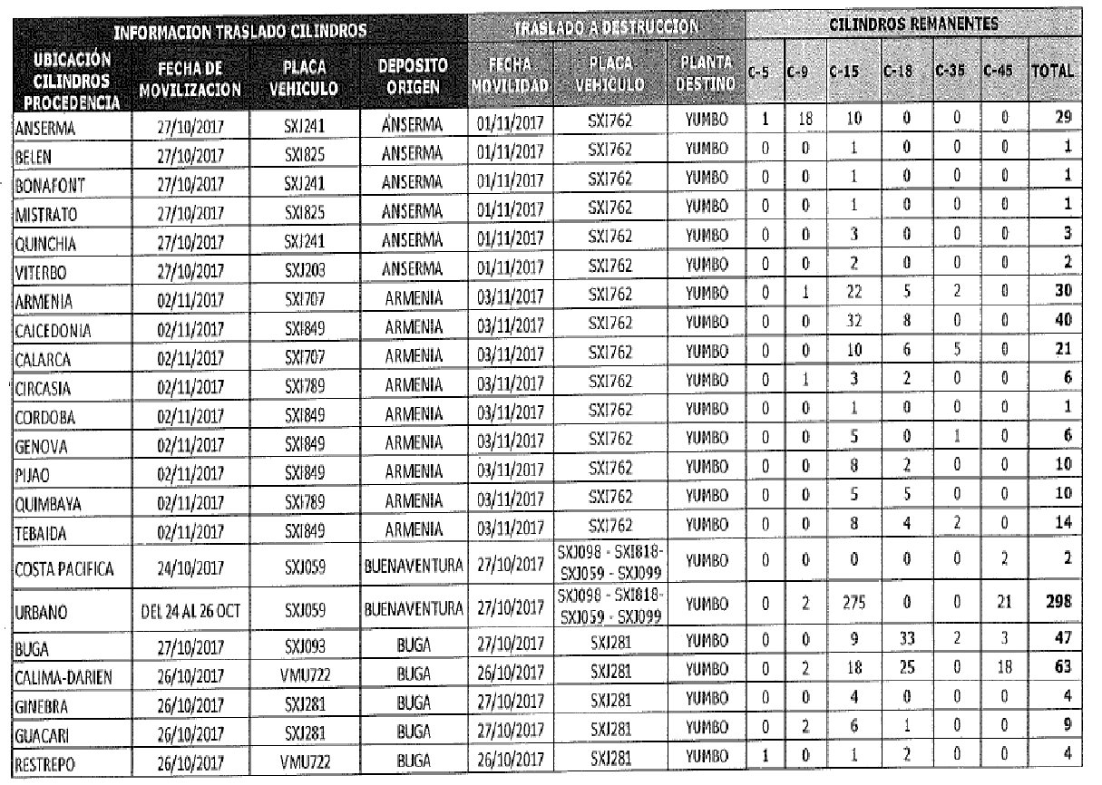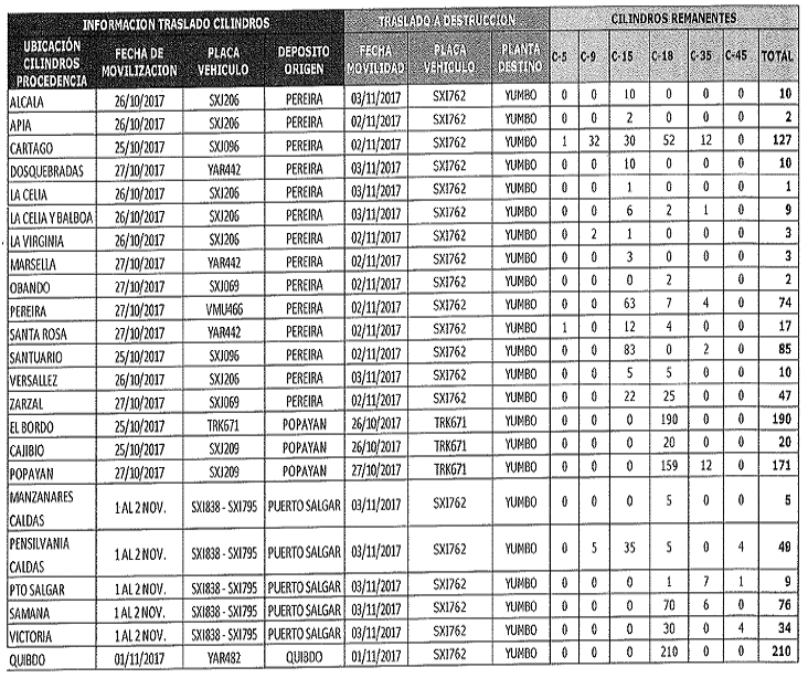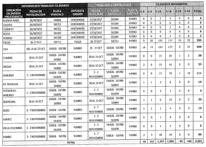 5. La destrucción de los anteriores cilindros se realizará los días 16, 17 y 18 de noviembre de 2017 en el taller autorizado CINSA ubicados en el Km 2.5 Vía Vijes – Mulalo en la ciudad de Yumbo, Valle del Cauca.