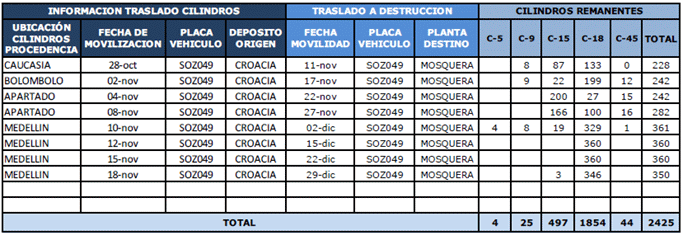 Los cilindros serán traslados al taller de CINSA, ubicado en Km 4 Vereda Balsillas Vía la Mesa, en la cuidad de Mosquera, Cundinamarca; para su destrucción en las siguientes fechas: