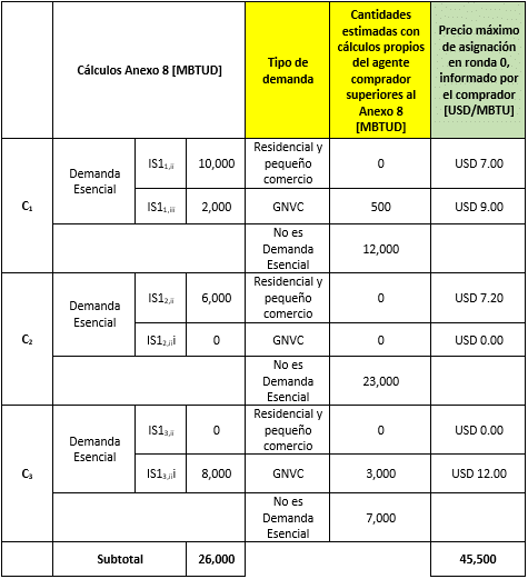 En un proceso de concurrencia con subasta, las cantidades a priorizar, es decir, las cantidades ofertadas que serán descontadas de la oferta corresponden a la suma de las cantidades calculadas en aplicación del Anexo 8, para la demanda de usuarios regulados y para la demanda de usuarios no regulados, ambos que son parte de la definición de Demanda Esencial. Se entiende entonces que la asignación de las cantidades priorizadas es parte de la subasta o del procedimiento de concurrencia y no que la subasta se realiza después de la asignación de las cantidades priorizadas a Demanda Esencial. Es por eso que el precio de asignación a la demanda regulada es el Precio de Reserva de la subasta y que el precio de asignación de la demanda no regulada es el precio de cierre de esa misma subasta.