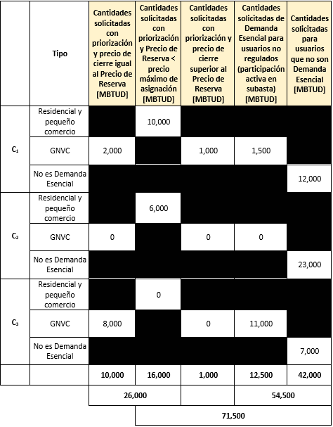 En este ejemplo, después de iniciada la subasta no puede haber adición a las cantidades inicialmente solicitadas por los compradores, por lo que la información inicial que requiere el vendedor a los compradores, correspondería a: i.) Precio máximo para asignación de las cantidades priorizadas, tanto para la demanda regulada como para la demanda no regulada, ambas de la Demanda Esencial; ii.) Cantidades priorizadas, que no pueden superar las cantidades obtenidas por los compradores según el Anexo 8, con Precio de Reserva para la demanda regulada y con precio de cierre de la subasta para la demanda no regulada; iii.) Cantidades adicionales no priorizadas que pasan a ser parte de la ronda 1 de la subasta en adelante, junto con las cantidades solicitadas que no hacen parte de la Demanda Esencial.