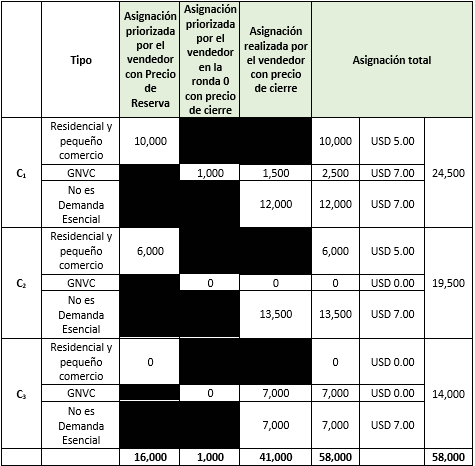 Ahora, si la cantidad ofertada es superior a la suma de las cantidades totales solicitadas por los compradores para atender la demanda en general de usuarios regulados y no regulados de la Demanda Esencial y de la demás demanda, lo que debería ocurrir es que se asignan todas las cantidades con el Precio de Reserva, que es el de la ronda 0 de la subasta, y se termina la subasta.