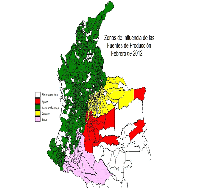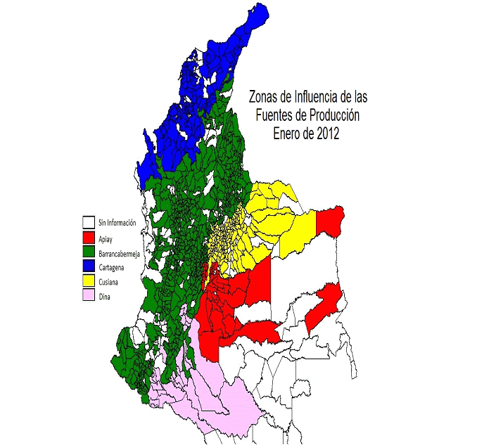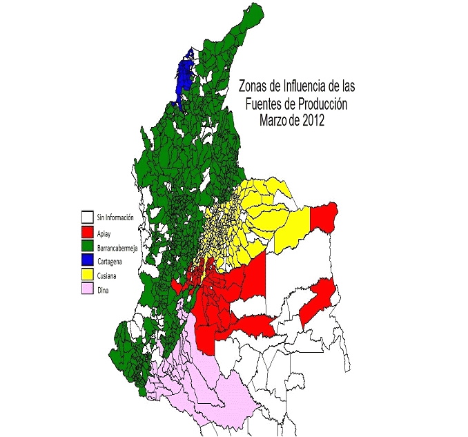 Mapa de Colombia con la identificación de los municipios de cada zona de influencia