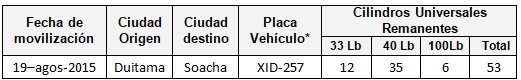 4. La movilización de los vehículos que transportan los cilindros universales remanentes autorizada en el numeral 1 deberá hacerse únicamente entre las ciudades origen y destino respectivos. La dirección de la planta de origen es kilómetro 3 vía Paipa Duitama.