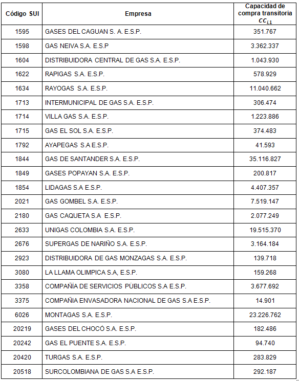 Es así que la Comisión de Regulación de Energía y Gas - CREG aprobó la publicación de la presente Circular, la cual tiene en cuenta la aplicación del parágrafo transitorio previsto en el artículo 9o de la Resolución CREG 063 de 2016, adicionado por el artículo 1o de la Resolución CREG 227 de 2016. Es así que las siguientes corresponden a las capacidades definidas y en firme para los distribuidores de GLP que deben ser consideradas para el primer período de compra por parte de los comercializadores mayoristas y distribuidores a efectos de dar cumplimiento a las obligaciones previstas en la regulación:
