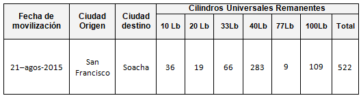 En respuesta a la anterior disposición regulatoria, la empresa COMBUSTIBLES LÍQUIDOS DE COLOMBIA S.A. E.S.P., que realiza las actividades de distribución y comercialización minorista en el departamento de Cundinamarca, mediante comunicaciones con números de radicado CREG E-2015-003453 y E–2015-008276, informó la cantidad de cilindros universales remanentes en su poder y la programación de movilización y destrucción de los mismos.
