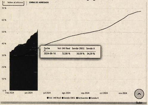 De otra parte, en el seguimiento a las variables energéticas del Sistema Interconectado Nacional (SIN) realizado el 16 de junio de 2024, a través de la verificación del embalse agregado presentado por el Centro Nacional de Despacho (CND) se observa lo siguiente: