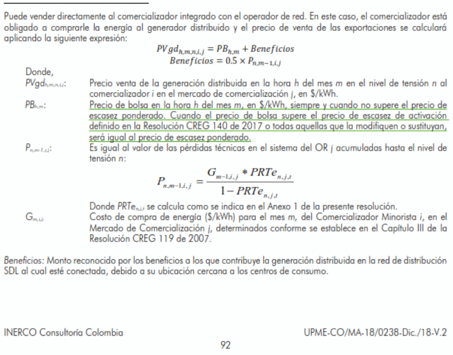 Hemos consultado literatura y hemos tomado como base el libro de la UPME valorización energética, y en unos de sus apartes en la pagina 92 citan textualmente “Puede vender directamente al comercializador integrado con el operador de red. En este caso, el comercializador está obligado a comprarle la energía al generador distribuido y el precio de venta de las exportaciones se calculará aplicando la siguiente expresión:”, adjunto esta la formula para saber el precio de venta tomado directamente del libro valoración energética.