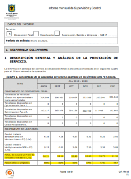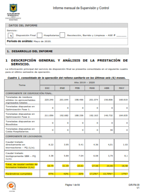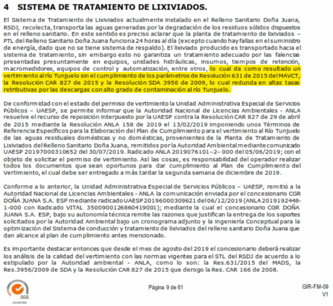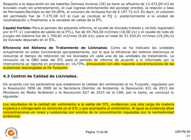 Y en los informes de la interventoría de Enero a Mayo 2020, sobre los volúmenes de lixiviados que se vertieron en el rio Tunjuelito con altas sustancias de descargas de contaminación.