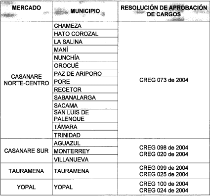 Como se observa en la tabla anterior, el Municipio de Trinidad en el Departamento del Casanare hace parte del Mercado Relevante para el cual se aprobó el Cargo Promedio de Distribución por uso del Sistema de Distribución y el Cargo Máximo Base de Comercialización de gas combustible por redes a usuarios regulados mediante Resolución CREG 073 de 2004, en virtud de solicitud tarifaria presentada por la EMPRESA DE ENERGÍA DE CASANARE S.A. E.S.P., ENERCA S.A. E.S.P.