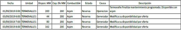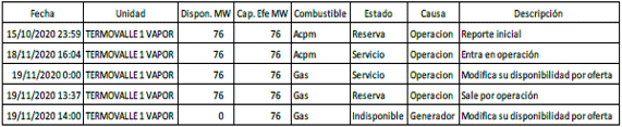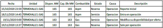 Posterior a la implementación de lo establecido en la Resolución CREG 044 de 2020, en los sistemas de información del CND se encuentran registrados los eventos de generación (disponibilidad, capacidad efectiva, combustible, causa, estado, tiempo de ocurrencia, etc.) por unidades del ciclo combinado y no por bloque de generación como se observa en el siguiente ejemplo: