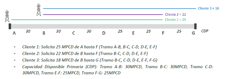 De acuerdo con los elementos de su ejemplo, lo primero para señalar es que en los tramos A–B y F-G no hay congestión contractual. Esto, suponiendo que el valor de la CMMP en esos tramos es igual a la capacidad disponible primaria.