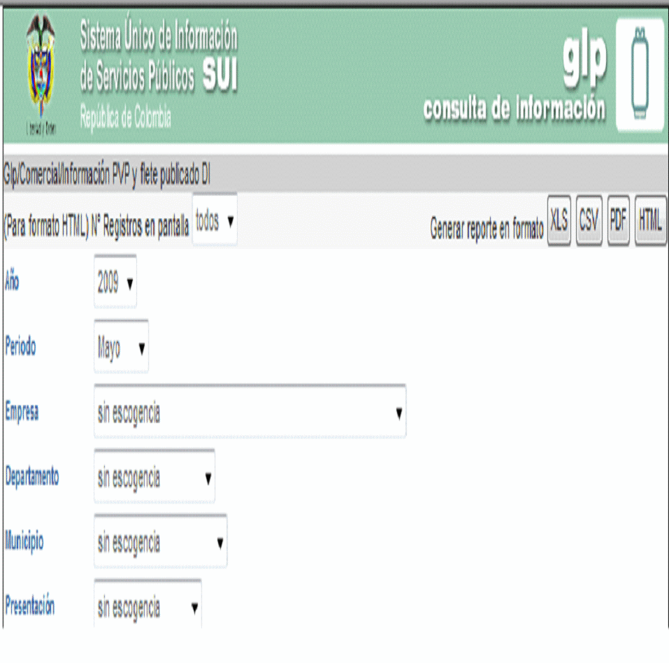 Allí se despliega la siguiente pantalla a través de la cual podrá escoger la información que desee ya sea por año, mes, empresa, departamento, municipio, tipo de cilindros, etc.: