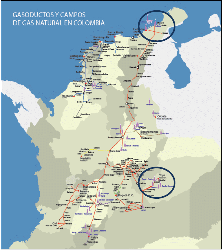 El gas natural en el país se obtiene de los campos de producción Ballena y Chuchupa en La Guajira (60% de la producción nacional) y del campo de producción Cusiana en el Casanare (27% de la producción nacional).