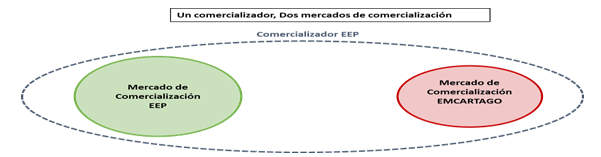 - Una vez Empresa de Energía de Pereira asuma la operación de EMCARTAGO y de acuerdo con la estructura definida por la SSPD que impide la unificación de los mercados, QUEDARÍA UN ÚNICO COMERCIALIZADOR COMO EMPRESA DE ENERGÍA DE PEREIRA CON DOS MERCADOS DE COMERCIALIZACIÓN como se muestra en la siguiente figura:
