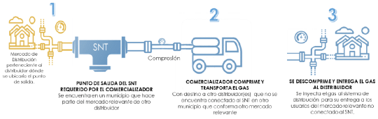 Un comercializador puro requiere solicitar conexión al SNT de un transportador (punto de salida) con el fin de extraer y comprimir gas natural para su comercialización con destino a la atención de uno o más distribuidores de gas combustible por redes de tubería que no se encuentran conectados físicamente al SNT. La ubicación del nuevo punto de salida estaría en un municipio que hace parte del mercado relevante de otro Distribuidor.