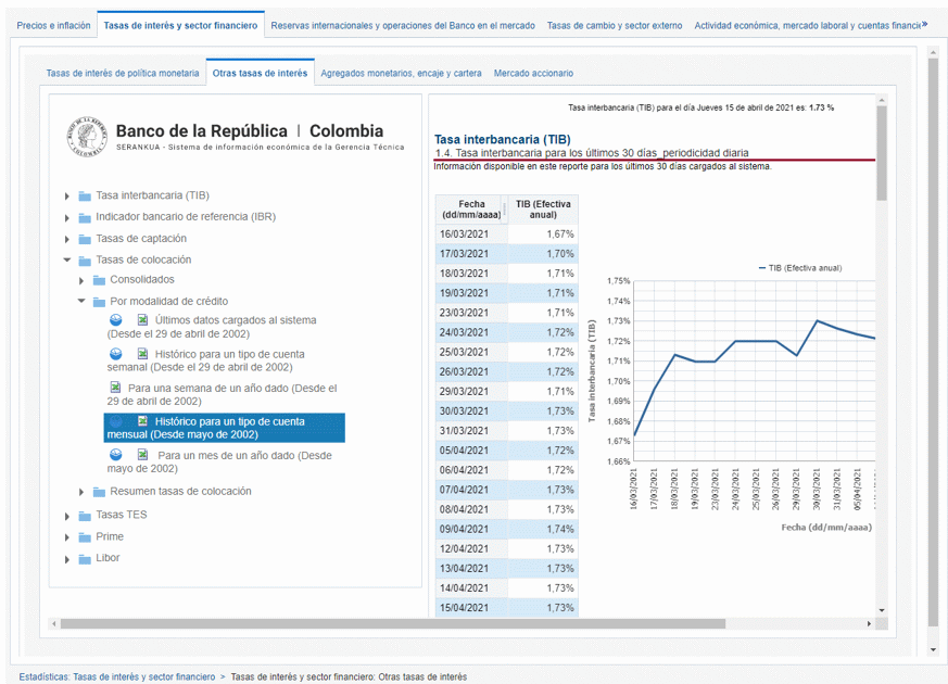 En el caso de la estimación del costo de deuda, variable Kd, el mismo se hace a partir de las tasas de colocación promedio mensuales disponibles en la página del Banco de la República. A continuación presentamos una imagen de la página web del Banco de la República, resaltando en azul el vínculo de donde actualmente se obtiene la información:
