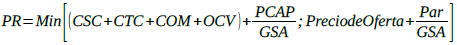 | Valor reconocido como costo de arranque-parada asociado con la generación de seguridad fuera de mérito. Será igual a cero si la planta se arranca según el despacho ideal, o si arrancó desde un día anterior y continúa generando. El PCAP se actualiza aplicando la siguiente formula: |