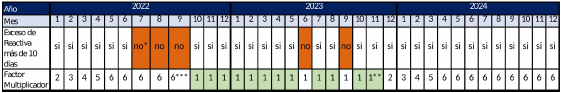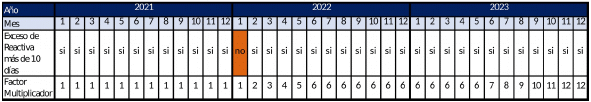 Posteriormente se incurrió nuevamente en la condición de transporte de energía reactiva en exceso sobre el límite, razón por la cual la variable M siguió aumentando hasta llegar al valor de M=6, momento a partir del cual se cuentan 12 meses antes de subir nuevamente, ante la persistencia de la condición de transporte de energía reactiva en exceso sobre el límite.