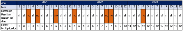 Nótese que en el mes 3 de 2021 no se presentó la condición de transporte de energía reactiva en exceso sobre el límite y por ello no se incrementó el valor de la variable M.